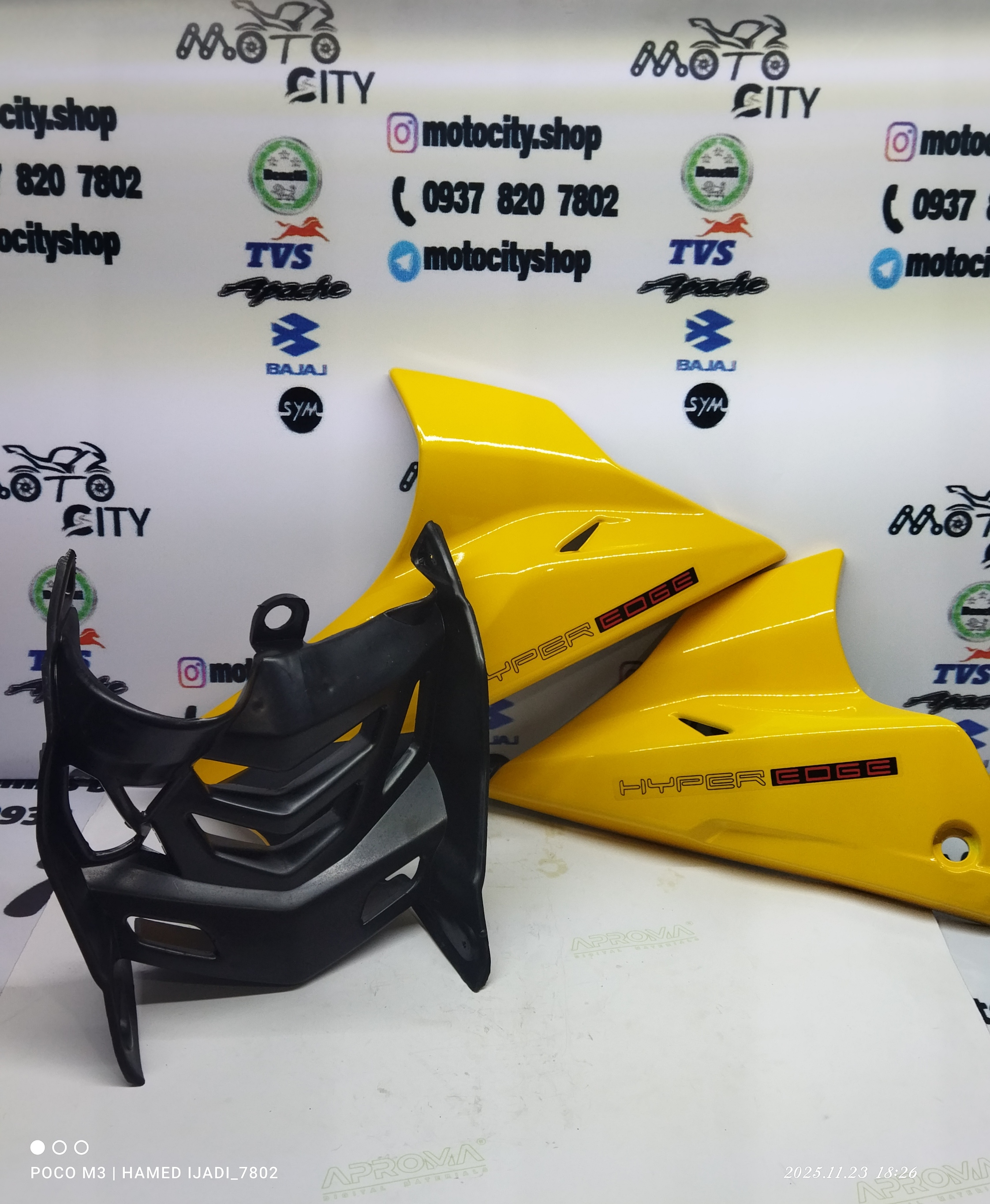 اسپایلر(قاب زیر انجین)سمت چپ و راست و وسطی موتور آپاچی۱۵۰,۱۶۰,۱۸۰کامل رنگ زرد(سه تیکه)شرکتی